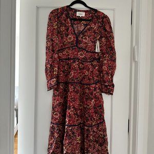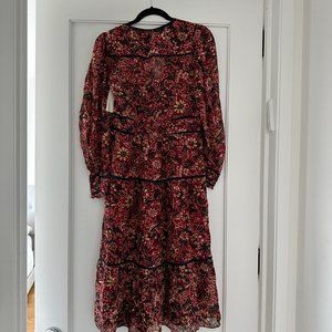 BA&SH Gigi Midi Dress Tiered All-over Floral Print Burgundy V-neck Long Sleeve
