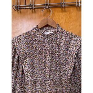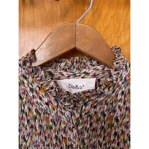 Excellent preowned condition, no noted wear or flaws. Measures 19” across underarms, 32.5” front shoulder to hem. 53/45/2 viscose silk metallic blend. Viscose lined.