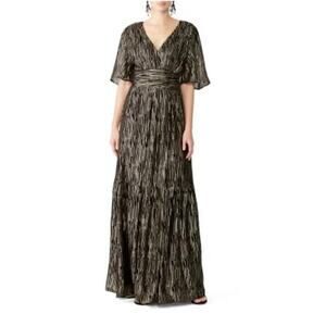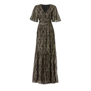 Black and gold viscose gown. ( 45% viscose 28% silk 27% metallic). Short sleeves. V-neckline. Hidden side zipper closure. 54.5” from shoulder to hemline.