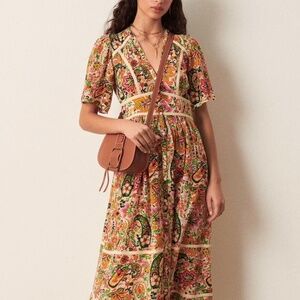 The BA&SH Benja dress in green is a 70s inspired midi dress with an all over colourful paisley pattern. The v neck dress has short flared sleeves and buttons all the way down the centre front. The dress has solid cream stripes under the chest, on the waist and on the skirt with contrast beautifully with the print. This dress looks amazing on and screams summer, whether you're wearing it everyday or saving it for your holidays, you'll love it.