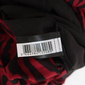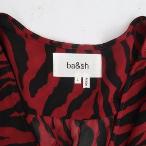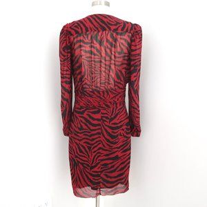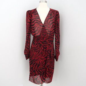 Ba&sh Saphir fixed wrap dress. Red & black tiger stripe pattern. Shoulder pads. Invisible zipper & snaps at side. Gathered waistband. Sheer top, lined skirt. 100% polyester georgette. Size 3, equals US 10 or Large. Garment measurements-- bust: 43" waist: 31 1/4" shoulder width: 15" sleeve length measured from top of sleeves: 26 1/2" hips: 41 1/2" front length from top of shoulder at neckline, measured straight down: 40"