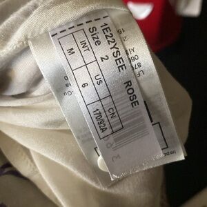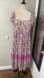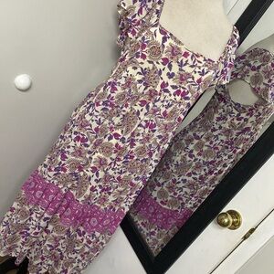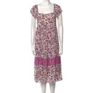 This beautiful dress from BA&SH features a square neck, flutter cap sleeves, sheared empire waist, sheared hem with contrast insert, all over floral print, v back, keyhole with button closure, side conceal zip closure. It fits true to size. It is a relaxed fit through the bust waist and hips. non-stretch fabric and it is designed to hit below the knee