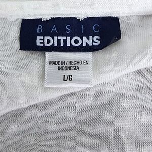 Basic Edition women's top. Size large. Bell sleeves. White raised dots. 75% polyester. 25% Rayon. Like new. No tears or stains.