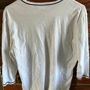 White tee with dark navy trim around neck and sleeves