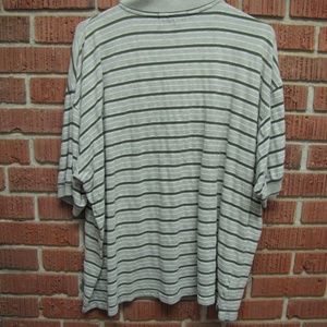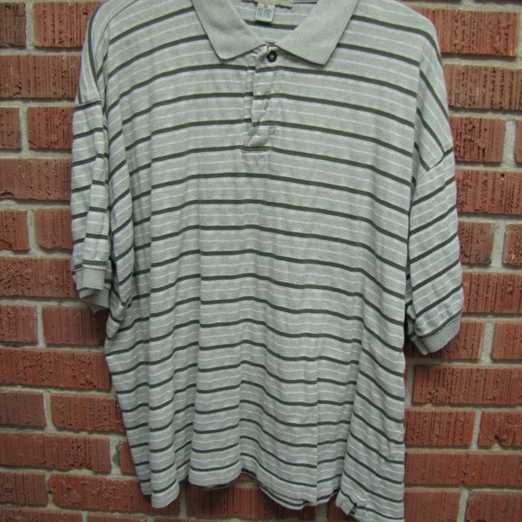 BASIC EQUIPMENT SHORT SLEEVE POLO TYPE SHIRT SIZE - XL BEIGE BACKGROUND WITH GREEN STRIPES