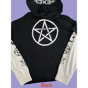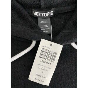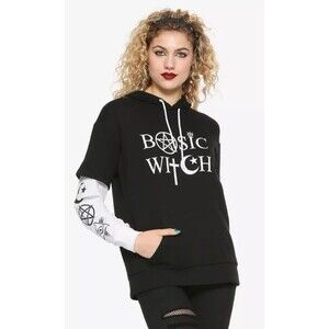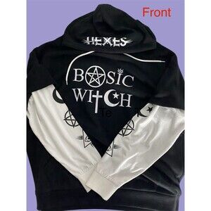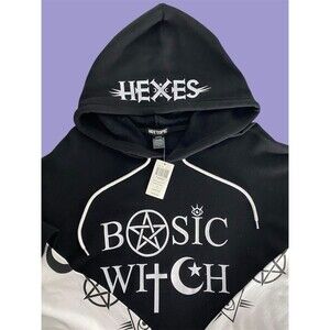 New with Tags Basic Witch black hoodie with white sewn on sleeves from Hot Topic. Perfect for Halloween. Marked Size 2 (plus size 2X, SUPER OVERSIZED, see measurements below). Pullover with hood. Has witchy designs on front, sleeves and hood.