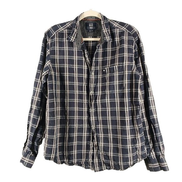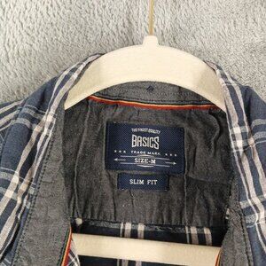 BASICS Men's Plaid Shirt (not flannel) Long Sleeve Navy Blue Size M Slim Fit
