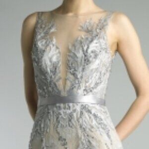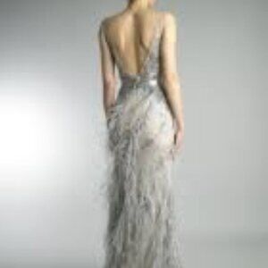 BASIX BLACK LABEL D9098L ILLUSION BURNOUT FEATHERED SLEEVELESS GOWN Silver