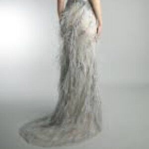Basix's stunning sleeveless gown is crafted of tulle. This intricately embellished style features an illusion neck, a burnout bodice, and an ostrich-feathered and lace skirt.