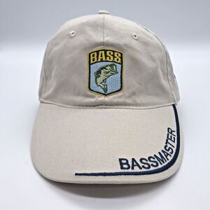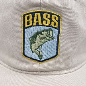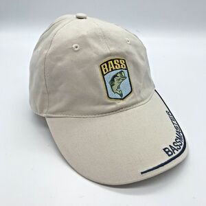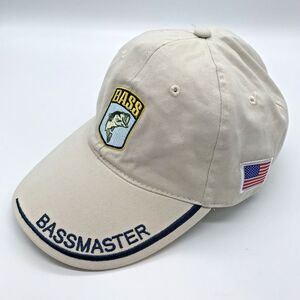 BASS Bassmaster , USA Flag, Professional Fishing Tour Baseball Cap. Unisex, Bronze Buckle adjustable Strapback, Beige Hat with embroidered Logo on front and brim and USA Flag on side.