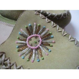 Unique - chartreuse green suede beaded moccasin style on low 1-5/8" stacked kitten heels! Whip-stitching throughout. Classic 1-1/2" sunburst radial beaded design at vamp. Signature padded insoles. Rubber soles. US 8. All measurements are approximate. LP*