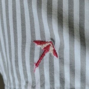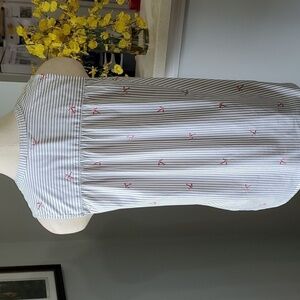 Bass women's vertical gray striped sleevless blouse. Size small with little embroidery umbrellas. Slip on and cool. Pit to pit flat measurement is 18.5 ". top to bottom length is 26". Good used condition.