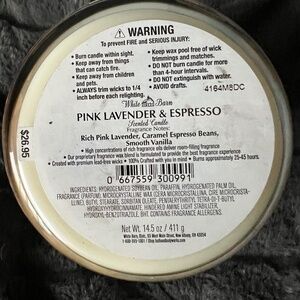 LAST ONE! Brand new Pink Lavender Espresso 3 wick candle from Bath & Body Works. Rich pink lavender, caramel espresso beans, and smooth vanilla with natural essential oils. Retired scent and sold out. I do have many retired fragrances, so please visit my closet to bundle.