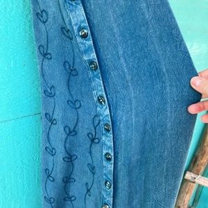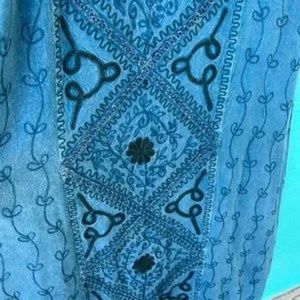 Washed denim look embroidered maxi dress with tie back belt. Tone on tone blue and black floral Embroidery all over and down the front. Buttons on side all the way down. Can slip dress over your head, no need to unbutton. Size is Free Size approximately 20” from underarm to underarm and 55” length Excellent Condition