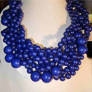 Stunning statement necklace. Features multiple strands of blue beads. Perfect for adding a pop of color.