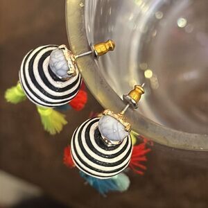 Super cute earrings with all kinds of tassels in colorful hues! Green, orange, kiwi, red, magenta, yellow, pink turquoise and the balls are black and white striped. Very fun!