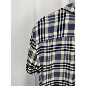 Collared, short sleeves, button front. Woven silk / viscose crepe in blue plaid.