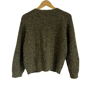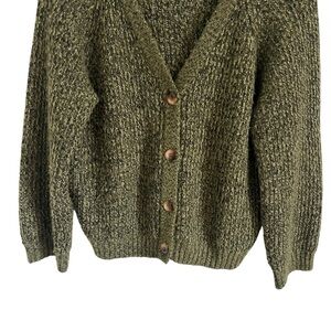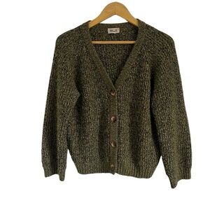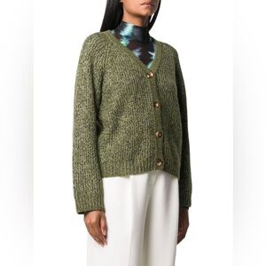 BAUM UND PFERDGARTEN Claretta Oversized Cardigan Sweater. Melange olive green wool-blend ribbed knit. V-neck. Front button placket. Long raglan style sleeves. SUPER soft alpaca Wool Blend.