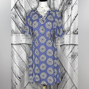 Printed doilies float down a silky dress framed by voluminous sleeves and tailored by smocking at the waist for shape.