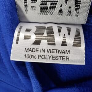 BAW Athletic Wear- Men's Blue Slip On Front Pockets Hooded Jacket Size XL. 100%Polyester. Approx. measurements 25 in. Sleeve length 28 in. Jacket length 31 in. Does Have couple spots of stain on right back sleeve area and very light on front top chest area. Pre-owned in good condition, no rips.