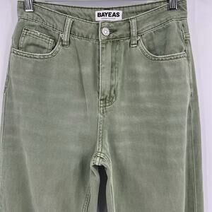 BAYEAS Wide Leg Jeans Green Denim High Rise Waisted Raw Hem Distressed 100% Cotton Cropped Style # BYF1103