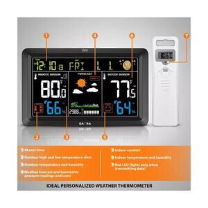 This weather station provides real-time weather information through a vivid HD color display. It is equipped with a remote sensor that accurately measures outdoor temperature and humidity, transmitting the data to the indoor display unit. The station is designed to help users monitor weather conditions easily and efficiently, featuring a wide range of functionalities.