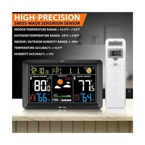 Display: HD color screen showing indoor and outdoor temperature, humidity, and weather forecast.