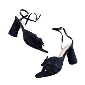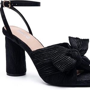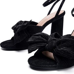 BAYQ Black Textured Fabric Bow Ankle Strap Block Heel Open Toe Heeled Sandals