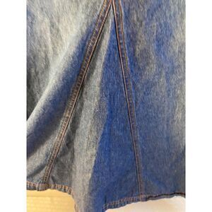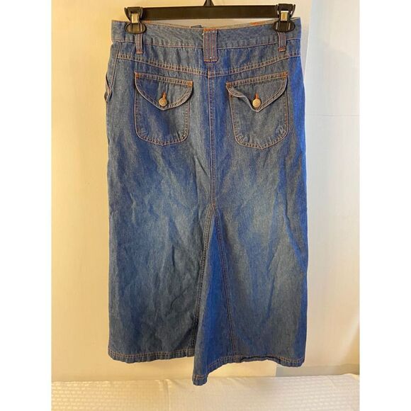 Denim skirt. Measures 30” waist. 32” long. 13” front slit. 17” hips. Belt loops. Red stitching.