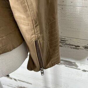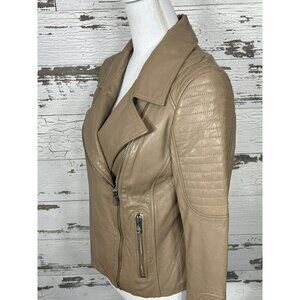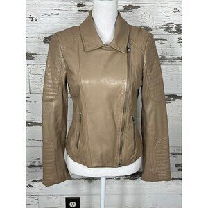 Crafted from premium leather, the BB DAKOTA Leather Heely Moto Jacket is a size S and comes in a stylish beige color. This jacket is brand new without tags. Asymmetrical zip front closure; zip close hip pockets and zippers at sleeve cuffs; fully lined.