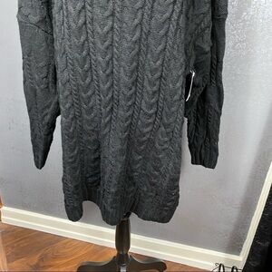 A chunky cable knit and boxy fit style a cozy-cute sweater-dress finished with slouchy dropped-shoulder sleeves.