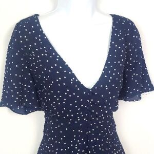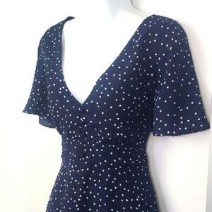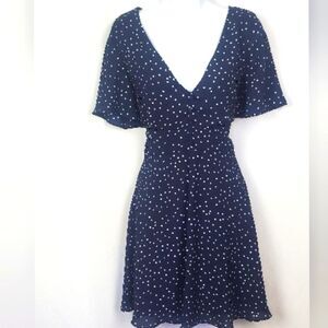 Explore any city in the la la land micro dot flutter sleeve dress with a breezy fit-and-flare silhouette. Fully lined, has button detail in front. No Stretch.