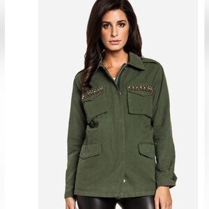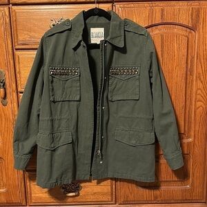 Oversized cotton utility jacket featuring two flap pockets on chest with mixed stud embellishment, two snap button hip pockets, front zipper closure with snap button storm flap, epaulets on shoulders, adjustable button cuffs, drawstring waist, and full lining. EUC