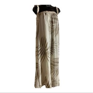 Palm Down is a palm print light reverse crepon midi dress with elastic neckline and off the shoulder straps.