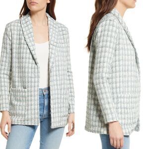 Go from day to evening in this textured bouclè blazer styled in soft allover checks with a versatile open front.