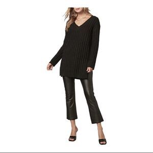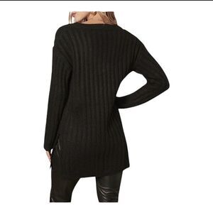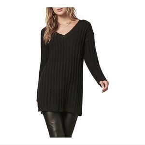 The Big Deal is a chunky ribbed knit tunic sweater with a V-neckline and vented hem detail.