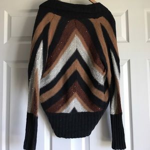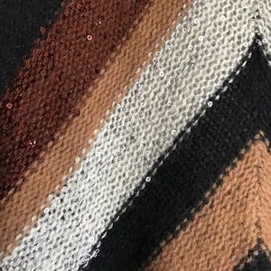 Open front cardigan with black, brown, tan and grey chevrons pattern. Sequins stitched through the grey and brown sections. It's a cute sweater but do note that the wrist opening is very small. Once on you can't push up the sleeves past the wrist.