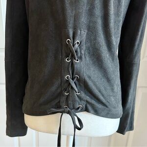 This soft black faux suede jacket by BB Dakota is made of a cool stretch material that makes it both lightweight and fit comfortably while looking like real suede. The underarms are made of a stretch knit fabric for a perfect fit and the back has a fun lace up section at the bottom. It even has pockets! In excellent condition. No stains or holes. 20” pit to pit, 21” length, 21.5” sleeves.