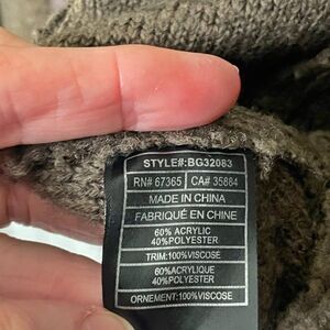 Description: 60% Acrylic, 40% Polyester, Closing ornament 100% Viscose; inside button closes sweater along with side toggle fastener closure around black peg; two pockets, shawl collar; style BG32083, RN#67365