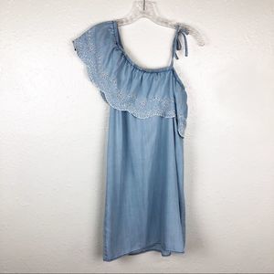 Brand new with tags. BB Dakota Chambray Embroidered Eyelet Izzy Chambray Dress. One shoulder neckline. Tie strap. Approximate Length 35” (from top of ruffled shoulder to hem). Size Large.