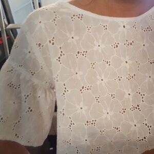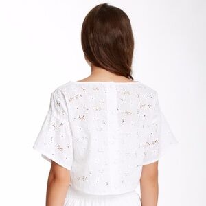 Eyelets on airy gauze add ladylike charm to this cropped BB Dakota top. Pintucking lends subtle volume to the dropped short sleeves. Buttoned back placket. Sheer.