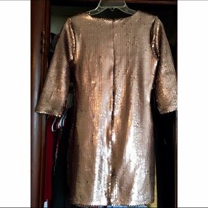 • Copper/bronze color • Sequined • Short sleeve • Mini dress • Some stretch • Hand wash • Size medium • 33.5 inch length laying flat • This adorable dress is perfect for any party or a night out on the town. Adorable paired with some stellar heels, this dress is begging you to make an offer!