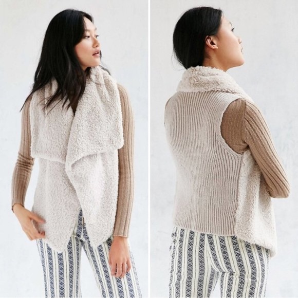 BB Dakota Cream Faux Fur Knit Back Open Front Rennie Sweater Vest. Revolve. Sleeveless. Shawl collar. Soft faux fur front with ribbed knit back. Polyester acrylic blend. Retail: $102. Size Medium. Armpit to armpit: 18.5". Length: 28.5". (OIB)