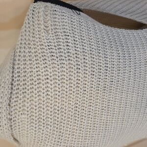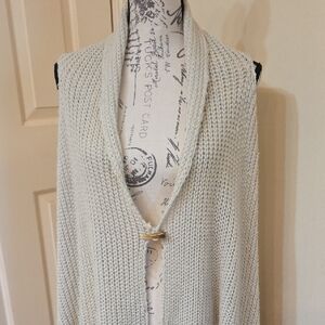 Stylish knit vest with fringe detail. Open front design. Perfect for layering. Note there is a bit of a pull on the right shoulder from slipping on a clothes hanger, this is reflected in the price.