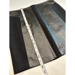 This BB Dakota Damien Leather Stretch Panel Mini Skirt is 100% leather, and the paneling is 100% viscose. It is 17 1/2 inches in length and measures 15 inches across in the waist. The skirt has a back zip entry.