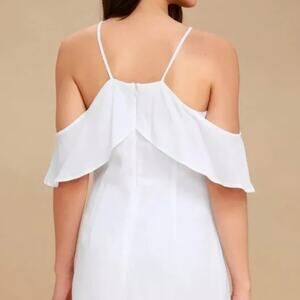 BB Dakota white cold shoulder off the shoulder sheath dress. Chest cutout. Hidden back zip. Lined. Semi sheer. Shell 60% viscose, 40% rayon. Lining 100% polyester.