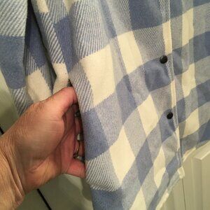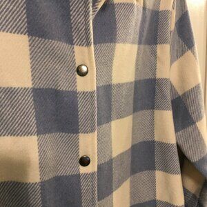 Blue checked cozy shacket jacket with silver snap button front closure and on sleeves.