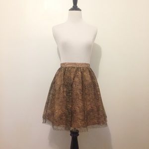 Size 6 NWT tan woven skirt with black & tan floral patterned mesh overlay from Jack by BB Dakota. Style: Powell. Approx. 16" waist to hem. 100% polyester. Left side seam zipper.