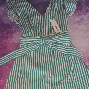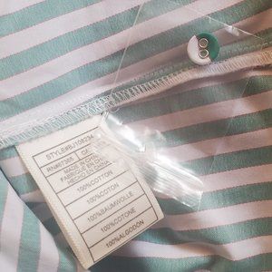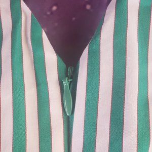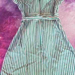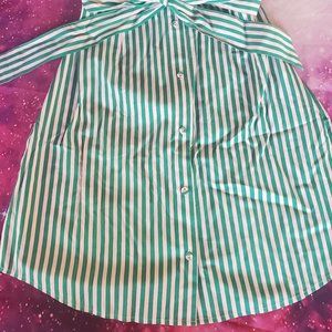 It is a beautiful clover green striped pattern with flutter sleeves, button down accents and a matching belt that. Not stretchy. Nice material & well made.
