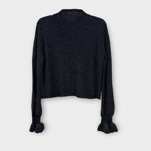 The Knit's Official is a soft and flowy lurex knit mockneck sweater with a gathered sleeve cuffs.